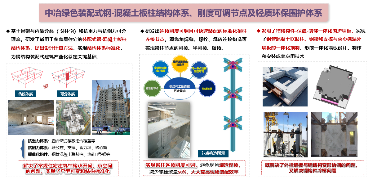 (3)中冶綠色鋼結構裝配式建筑關鍵技術:創新研發出適用于多高層住宅的裝配式鋼-混凝土板柱結構體系,開發了與鋼結構裝配式建筑配套的一體化輕質節能圍護墻板產品,提出了中冶綠色鋼結構裝配式建筑產業化成套技術、裝備、工藝和標準體系,實現了規?;瘧?。